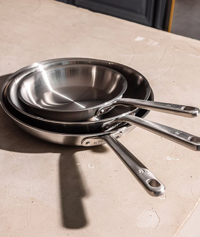 Nuestras sartenes totalmente de acero inoxidable están disponibles en varios tamaños: 20 cm, 26 cm y 28 cm de diámetro. Próximamente también ofreceremos una sartén de acero inoxidable de 30 cm de diámetro. Por ello, nuestras sartenes son aptas para todo tipo de cocinas y son adecuadas para todos, tanto si cocinas simplemente para ti como para grupos grandes. El juego de tres sartenes le permitirá por tanto diversificar al máximo sus placeres.