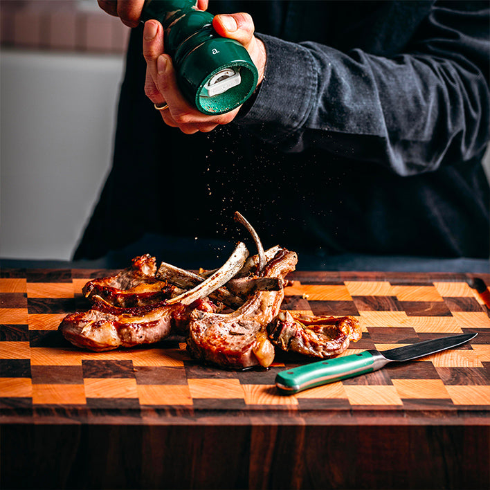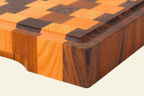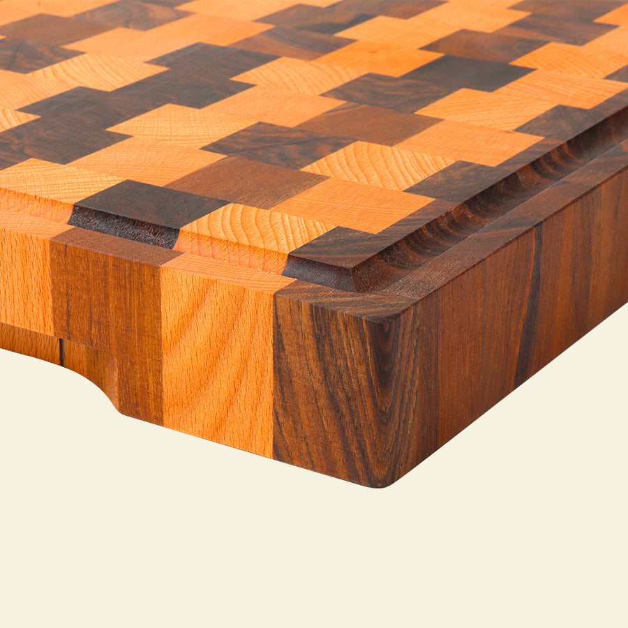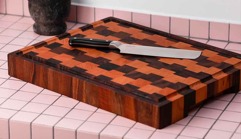 Diseñamos nuestra propia tabla de cortar con el taller de Chabret. Tras numerosas pruebas, optamos por una tabla de cortar de testa con patrón de tablero de ajedrez, hecha de dos especies de madera: haya y nogal. Los dos tonos combinan a la perfección. Para el diseño, optamos por tablas cuadradas y una posición descentrada para añadir un toque moderno y textura a la tabla.